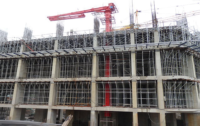 配置自動爬升系統(tǒng),在電梯井道內(nèi)或樓板上自動頂升,使布料機(jī)隨著樓層的升高而升高。