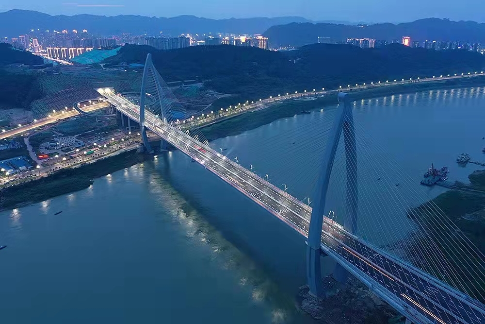 四川宜賓鹽坪壩長江大橋是宜賓市城市內環(huán)線的重要跨江節(jié)點工程,也是宜賓目前體量最大的橋梁。索塔是全國首次采用的“魚躍長江”造型,猶如一條躍出水面、向上飛騰的江魚。